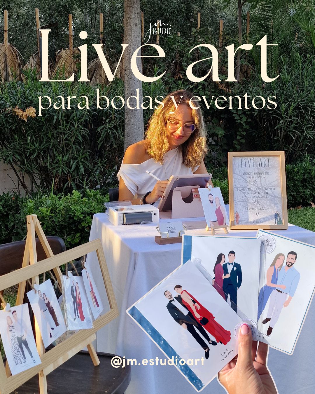 Durante tu gran día, no solo ofrezco ilustraciones personalizadas, sino que también se crea un espectáculo en vivo que cautivará a tus invitados. A través del arte en vivo, cada invitado podrá disfrutar del proceso de creación y, al mismo tiempo, se llevará a casa un recuerdo único: una ilustración personalizada impresa al instante.